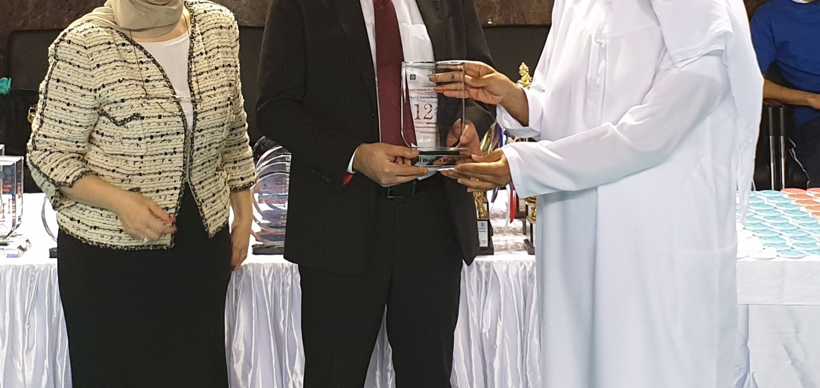 Al Wahda Mall in Abu Dhabi today received an award from H.E Helal Mohammed Al Hameli, Deputy Director General of Abu Dhabi Chamber of Commerce and Industry on behalf of HH Sheikh Nahyan Bin Mubarak Al Nahyan, UAE Minister of Tolerance as a venue sponsor for the 12th Annual Autism Awareness campaign that was held recently at the mall. Receiving the award at the Al Jazeera FC was Mr. Wajeb Al Khoury, Director of Line Investments and Property LLC.