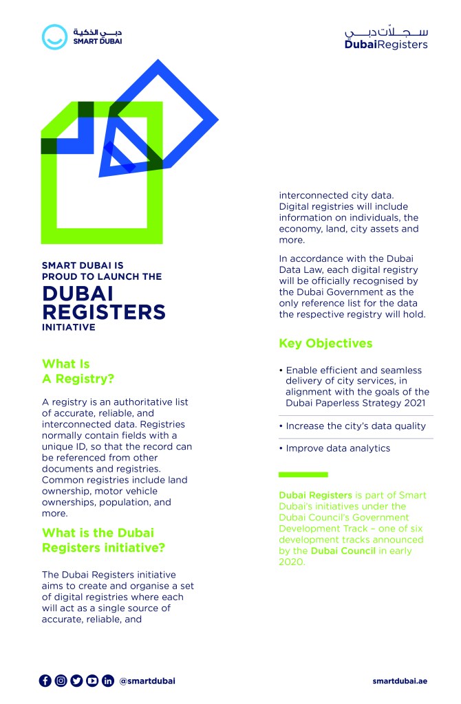 Smart Dubai has launched the ‘Dubai Registers’ initiative to build a network of accurate, reliable, and interconnected data registries for a sustainable and happy city. The project is part of the Government Development track – one of six development tracks announced by the Dubai Council in early 2020.