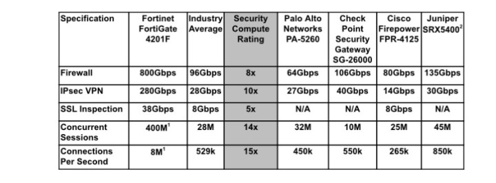 To deliver security that keeps pace with the scale and performance demands of the new realities of today’s data centers, Fortinet is introducing the FortiGate 4200F, the newest addition to its portfolio of high-end network firewalls. As an integral part of the Fortinet Security Fabric, FortiGate 4200F has been specifically engineered to enable an innovative, security-driven networking approach that seamlessly integrates networking with security. The hardware acceleration of FortiGate 4200F via Fortinet’s seventh generation network processor, NP7, delivers Security Compute Ratings* 5 to 15 times better than comparable competitor solutions. Below is a comparison of the top firewalls on the market against FortiGate 4200F: