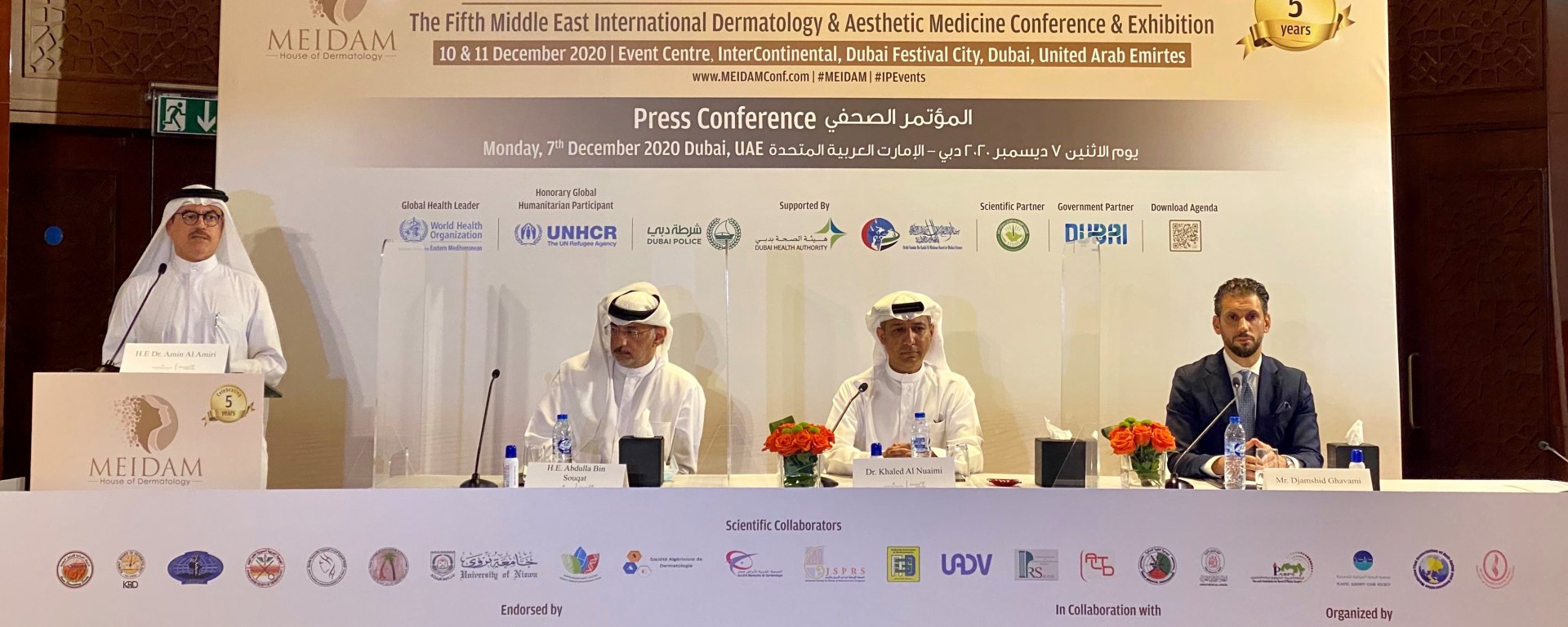 Under the Patronage of H.H. Sheikh Hamdan Bin Rashid Al Maktoum, Deputy Ruler of Dubai, UAE Minister of Finance, President of Dubai Health Authority, the 5th Middle East International Dermatology & Aesthetic Medicine Conference & Exhibition “MEIDAM 2020” shall be held in InterContinental Hotel – Dubai Festival City, on the 10th and 11th of December in the presence of representatives of World Health Organization (WHO) and the United Nations High Commissioner for Refugees (UNHCR) as a part of the Give-Back Program (Atta’) launched by MEIDAM Conference to instill a culture of giving-back to the community among dermatologists as well as Heads of Arab and International Societies. About 800 physicians and specialists are expected to attend in-person over the two days, in addition to about 3000 digitally from different continents of the world.