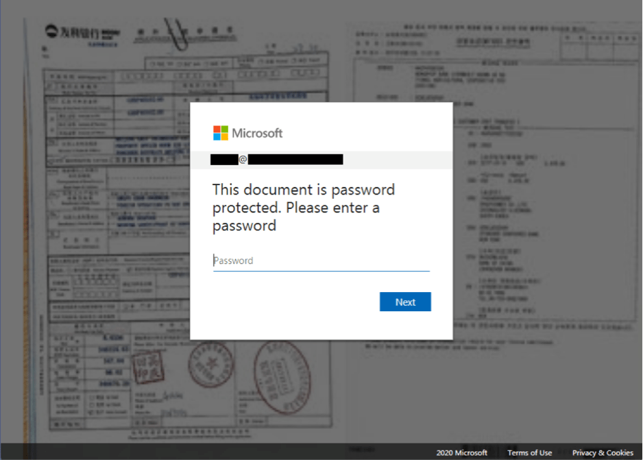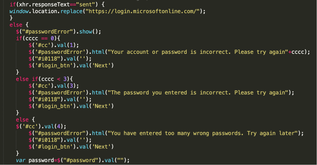 After the HTML file was launched, a JavaScript code would then run in the background of the document. The code was responsible for simple password checks, sending the data to the attackers’ drop-zone server, and redirecting the user to a legitimate Office 365 login page.