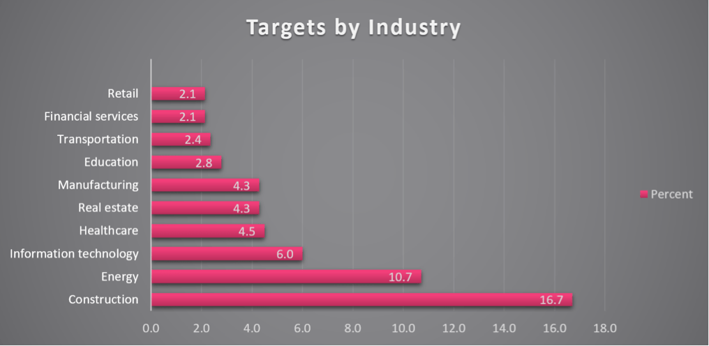 Although there was a wide distribution of targeted industries, there appears to be a special interest in Energy and Construction companies.