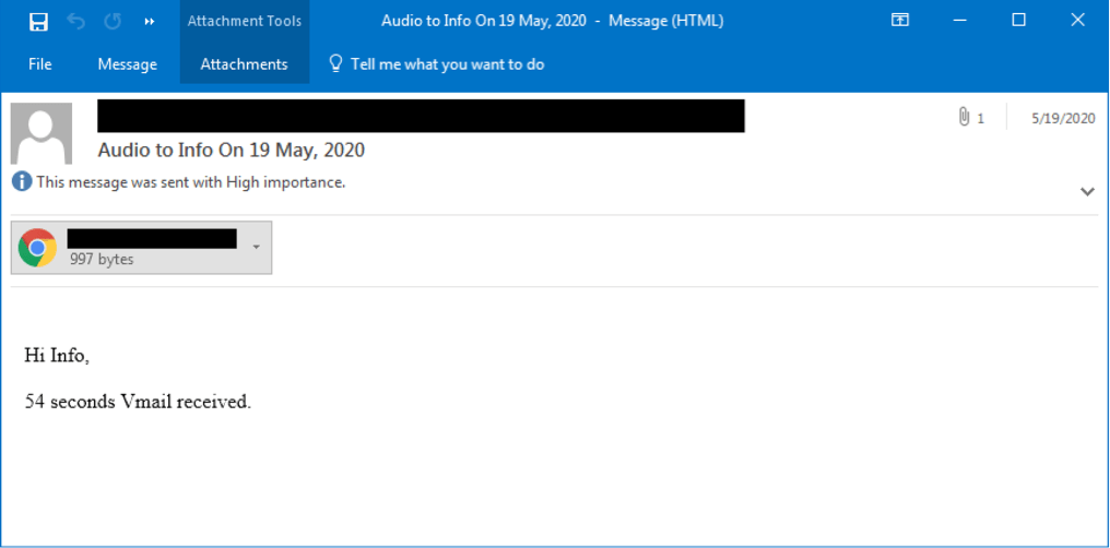 We discovered a phishing email from May 2020 that perfectly matched the TTP’s described above. It also used the same JavaScript encoding that was used by this campaign in August.