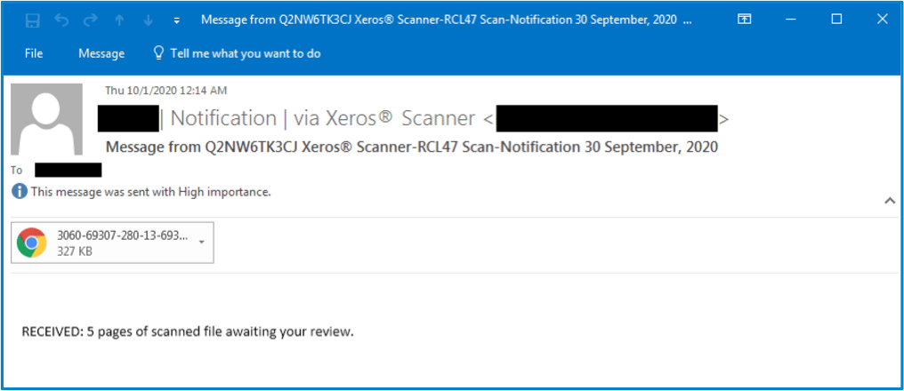 In August, attackers initiated a phishing campaign with emails that masqueraded as Xerox scan notifications, prompting users to open a malicious HTML attachment. While this infection chain may sound simple, it successfully bypassed Microsoft Office 365 Advanced Threat Protection (ATP) filtering and stole over a thousand corporate employees’ credentials.