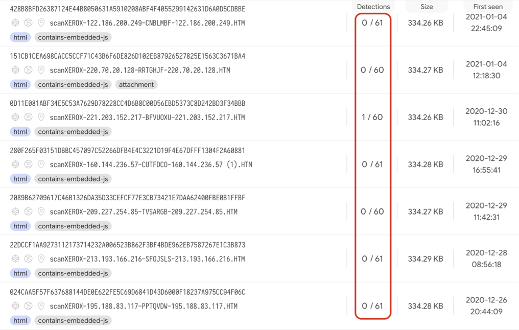 Figure 5: Low detection rates for the phishing pages on VirusTotal