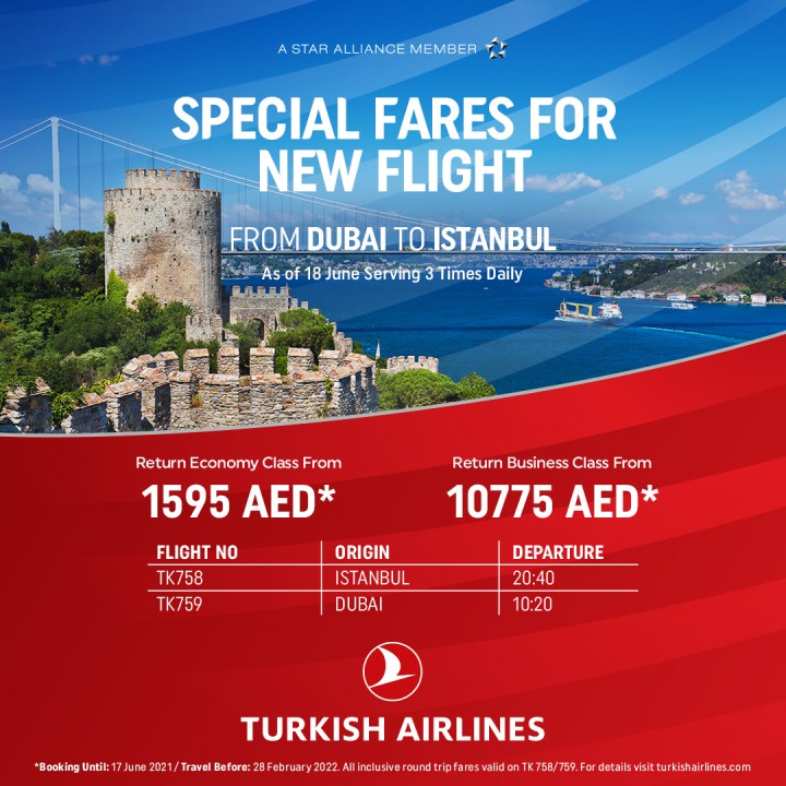 Turkish Airlines, flying to more countries than any other airline, increased the frequency of its Dubai to Turkey route to three daily flights to its Istanbul hub which connects travelers to over 300 destinations worldwide while maintaining the utmost care for a safe and healthy travel experience.