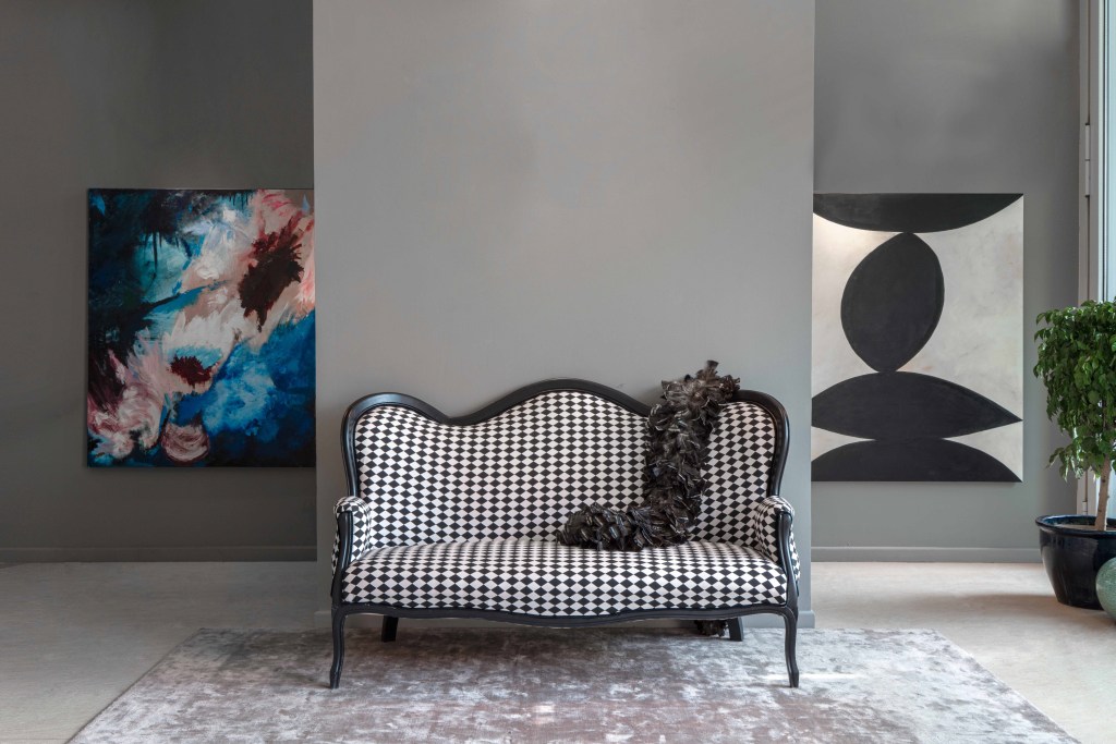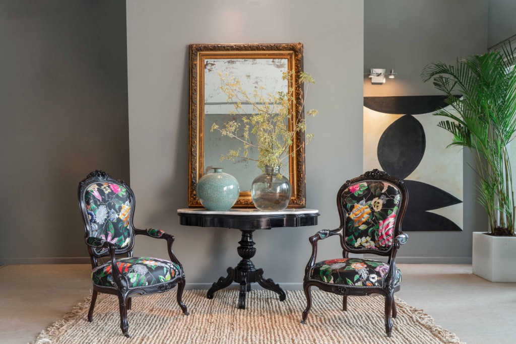 Valerie’s collection has a mirror from the 19th century, an elegant Art Nouveau display pedestal, Rainbow lounge chairs and a Napoleon III armchairs in blackened rosewood decorated on the back, the belt and the legs with delicate carved flowers. The elegance of these precious wood seats is enhanced by a Christian Lacroix fabric with a stylised rose motif.