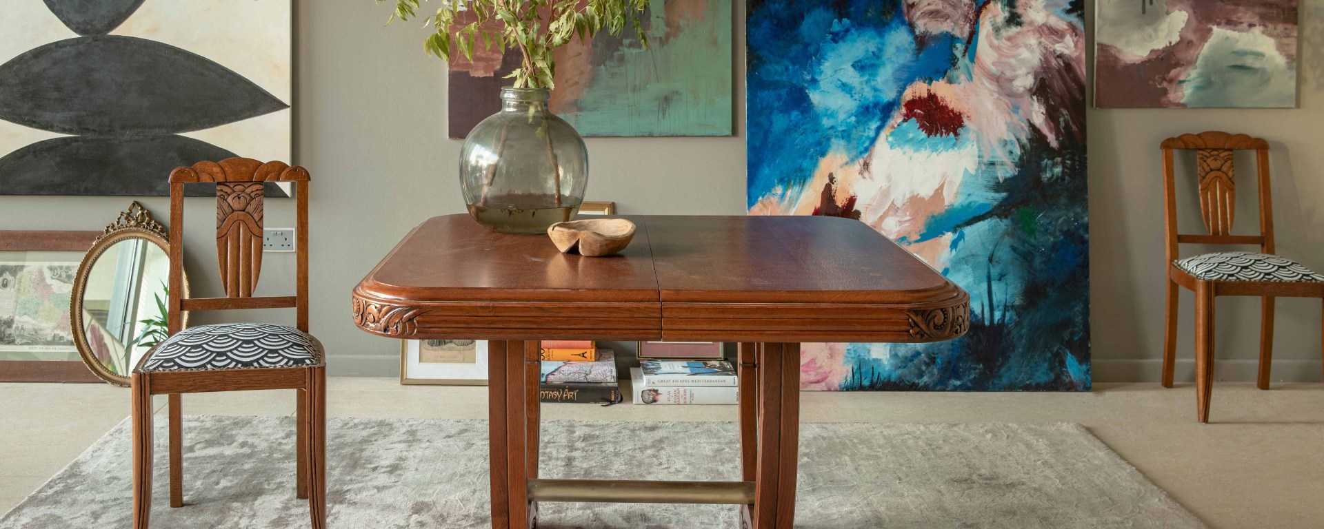 In each collection Valerie has seats, tables, chests of drawers and accessories. These include Art Deco dining room chairs upholstered in a contemporary fabric inspired by period motifs. Their elegant sobriety makes them timeless pieces. Among her collections is a fine Art Deco dining room table with beautifully carved legs and headband – the purity of its lines will harmonize perfectly with contemporary chairs for an unconventional and original decoration impression.