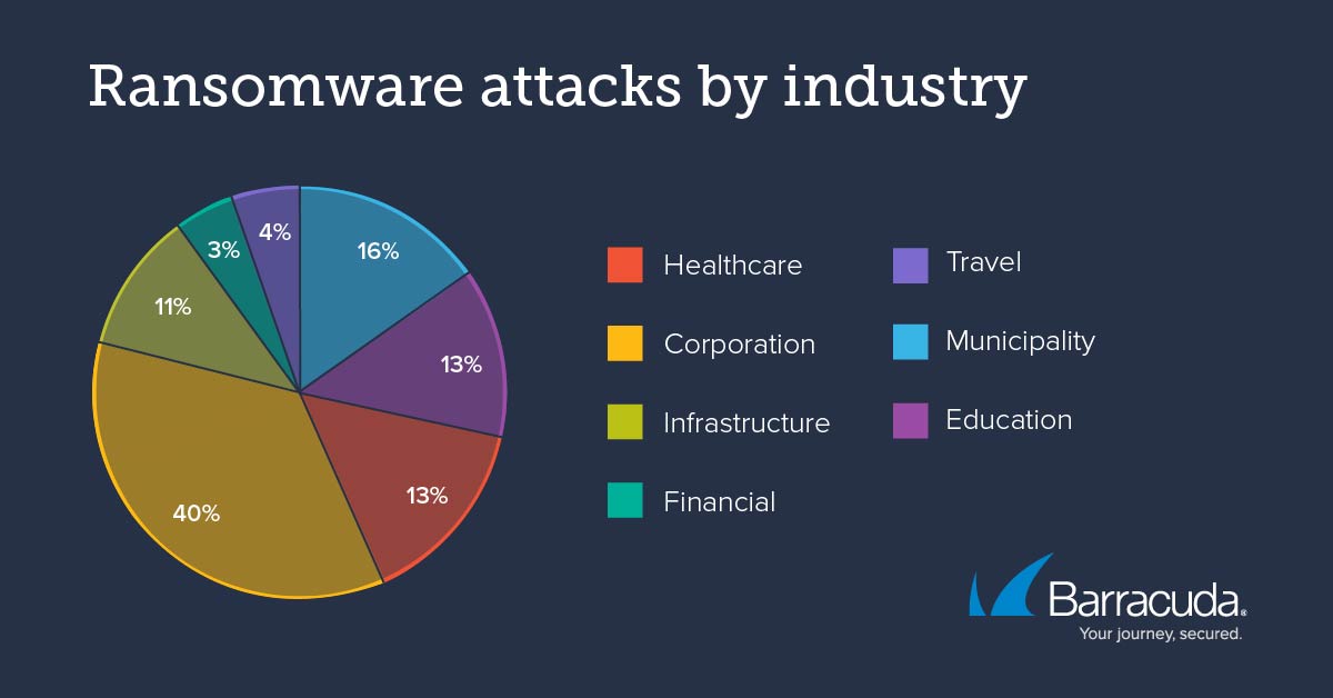 Barracuda researchers identified and analysed 121 ransomware incidents that occurred between August 2020 and July 2021, and saw a 64% increase in attacks, year over year. Cybercriminals are still heavily targeting municipalities, health care, and education, but attacks on other businesses are surging: