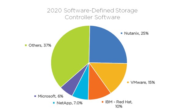 Note: IDC 2H2020 Semiannual Software-Defined Infrastructure Tracker, June 2021. Market referenced is the calendar year 2020 software-defined controller software (SDS-CS) functional market. SDS-CS market includes all discrete file, block and object-based SDS-CS solutions as well as all hyperconverged SDS-CS solutions. Market is software only and excludes the value of hardware.