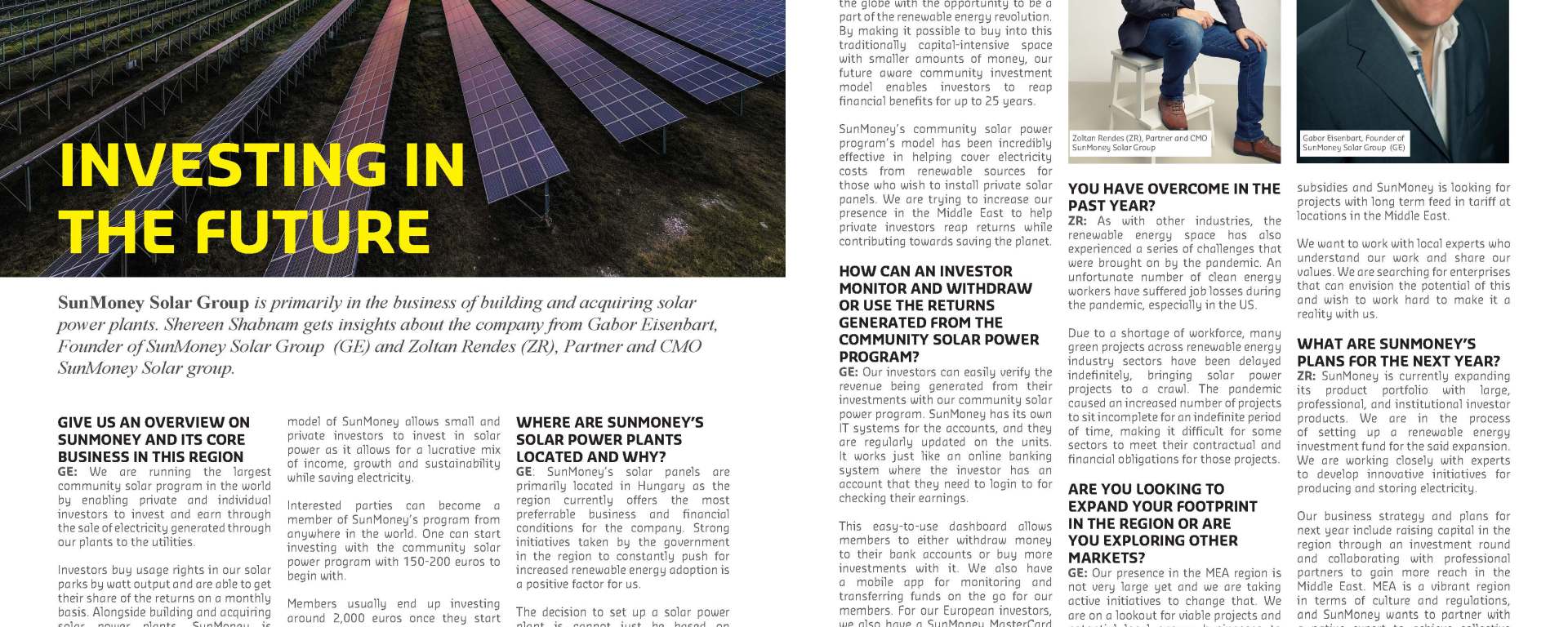 ZR: Being headquartered in Dubai has been an ideal choice considering the multi-cultural financial and economic hub that it is. We aim to provide everyone across the Middle East and the globe with the opportunity to be a part of the renewable energy revolution. By making it possible to buy into this traditionally capital-intensive space with smaller amounts of money, our future aware community investment model enables investors to reap financial benefits for up to 25 years. SunMoney’s community solar power program’s model has been incredibly effective in helping cover electricity costs from renewable sources for those who wish to install private solar panels. We are trying to increase our presence in the Middle East to help private investors reap returns while contributing towards saving the planet.