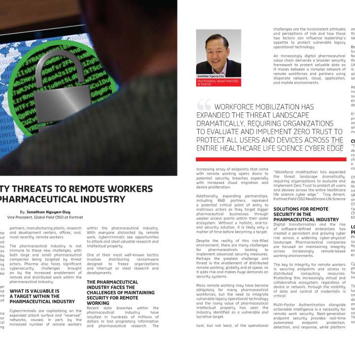 By Jonathan Nguyen-Duy, Vice President, Global Field CISO at Fortinet Industry Perspectives Of all the changes brought on by the pandemic, remote working as a standard business model is probably … Continue reading Cybersecurity Threats to Remote Workers In the Pharmaceutical Industry
