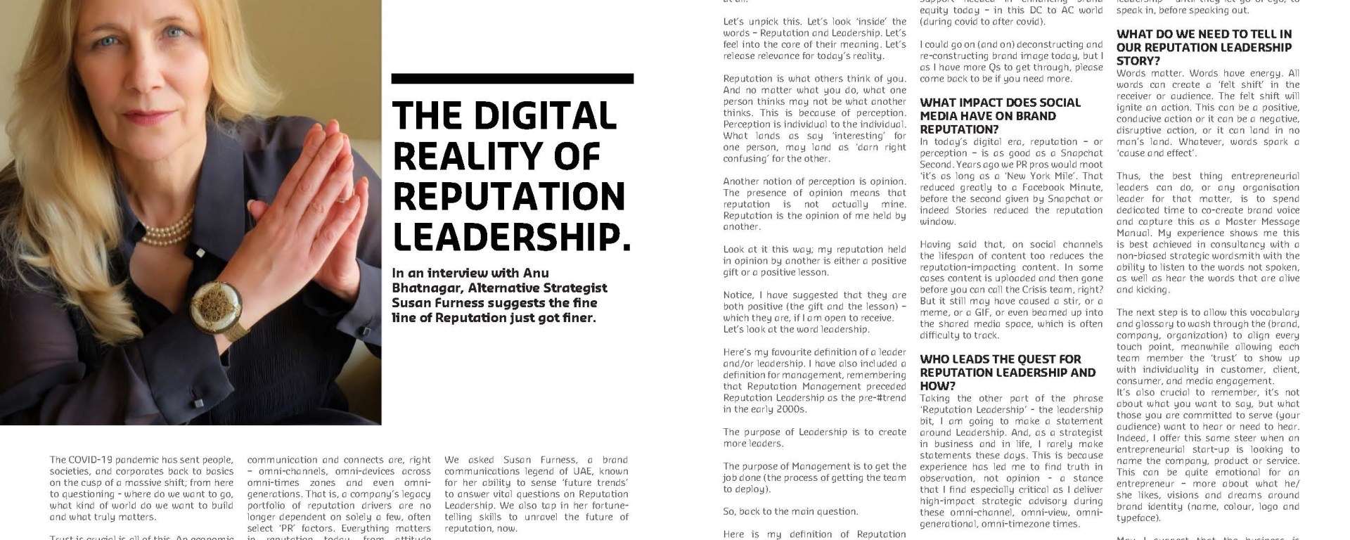 We asked Susan Furness, a brand communications legend of UAE, known for her ability to sense ‘future trends’ to answer vital questions on Reputation Leadership. We also tap in her fortune-telling skills to unravel the future of reputation, now.