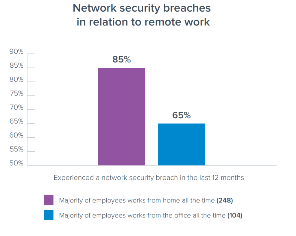 - Companies with staff working predominantly from home had a significantly higher network security breach rate (85%), compared to companies with staff working predominantly in the office (65%).