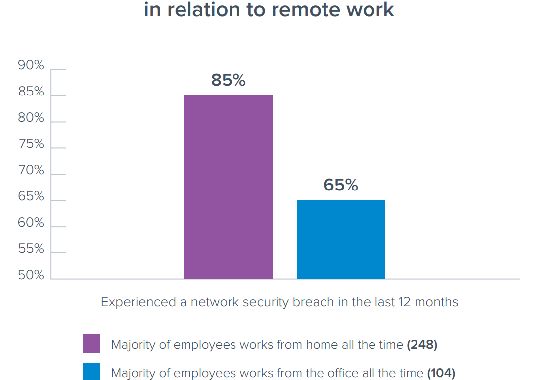 - Companies with staff working predominantly from home had a significantly higher network security breach rate (85%), compared to companies with staff working predominantly in the office (65%).