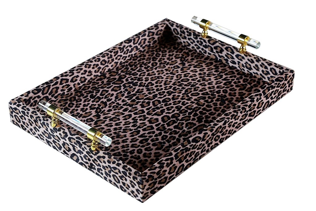 2: Shajja Decor Tray Brown Take your serving game up a notch with this trendsetting tray flaunting a leopard print appeal and acrylic crystal handles. A hint of gold adds to its pizzazz. Price: 110 AED