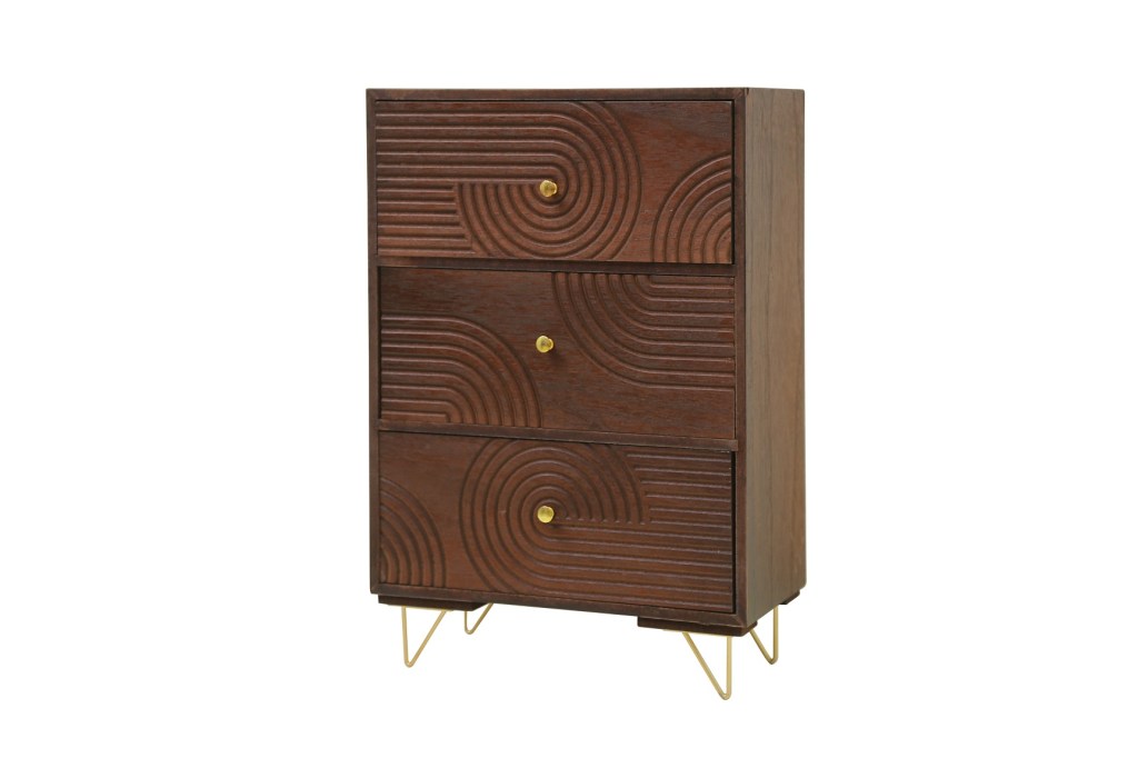 Everyone needs a storage drawer and getting one that looks good in any room is a bonus. The dark brown with gold touches and metal hairpin legs add a bit of glamour to the look and feel of this compact deco art storage piece. Price: 110 AED