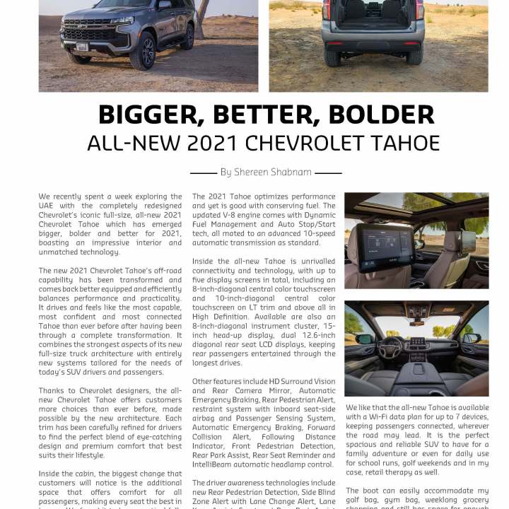 By Shereen Shabnam We recently spent a week exploring the UAE with the completely redesigned Chevrolet’s iconic full-size, all-new 2021 Chevrolet Tahoe which has emerged bigger, … Continue reading Bigger, Better, Bolder: All-new 2021 Chevrolet Tahoe