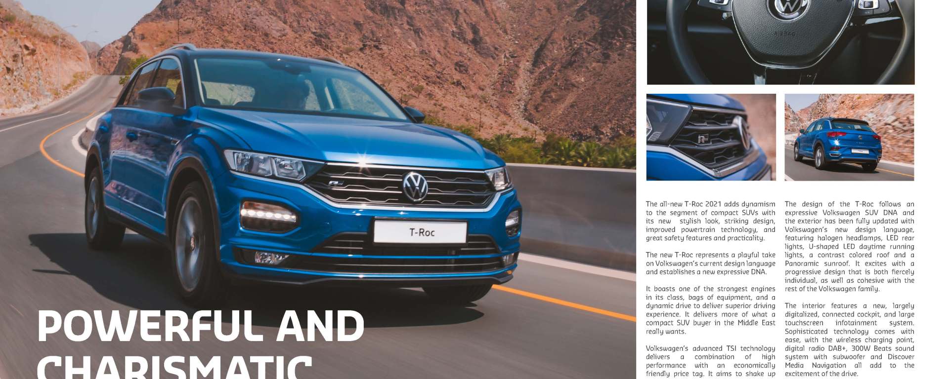 The new T-Roc represents a playful take on Volkswagen’s current design language and establishes a new expressive DNA. It boasts one of the strongest engines in its class, bags of equipment, and a dynamic drive to deliver superior driving experience. It delivers more of what a compact SUV buyer in the Middle East really wants.
