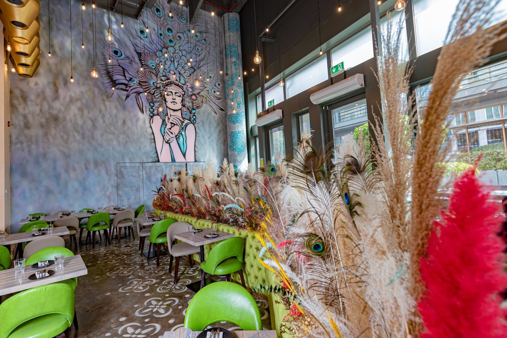 From the colourful potency of peacock features to a dramatic wall mural depicting a powerful crowned goddess – the new-look Farzi Café reflects its culture-rich, vibrant cuisine.