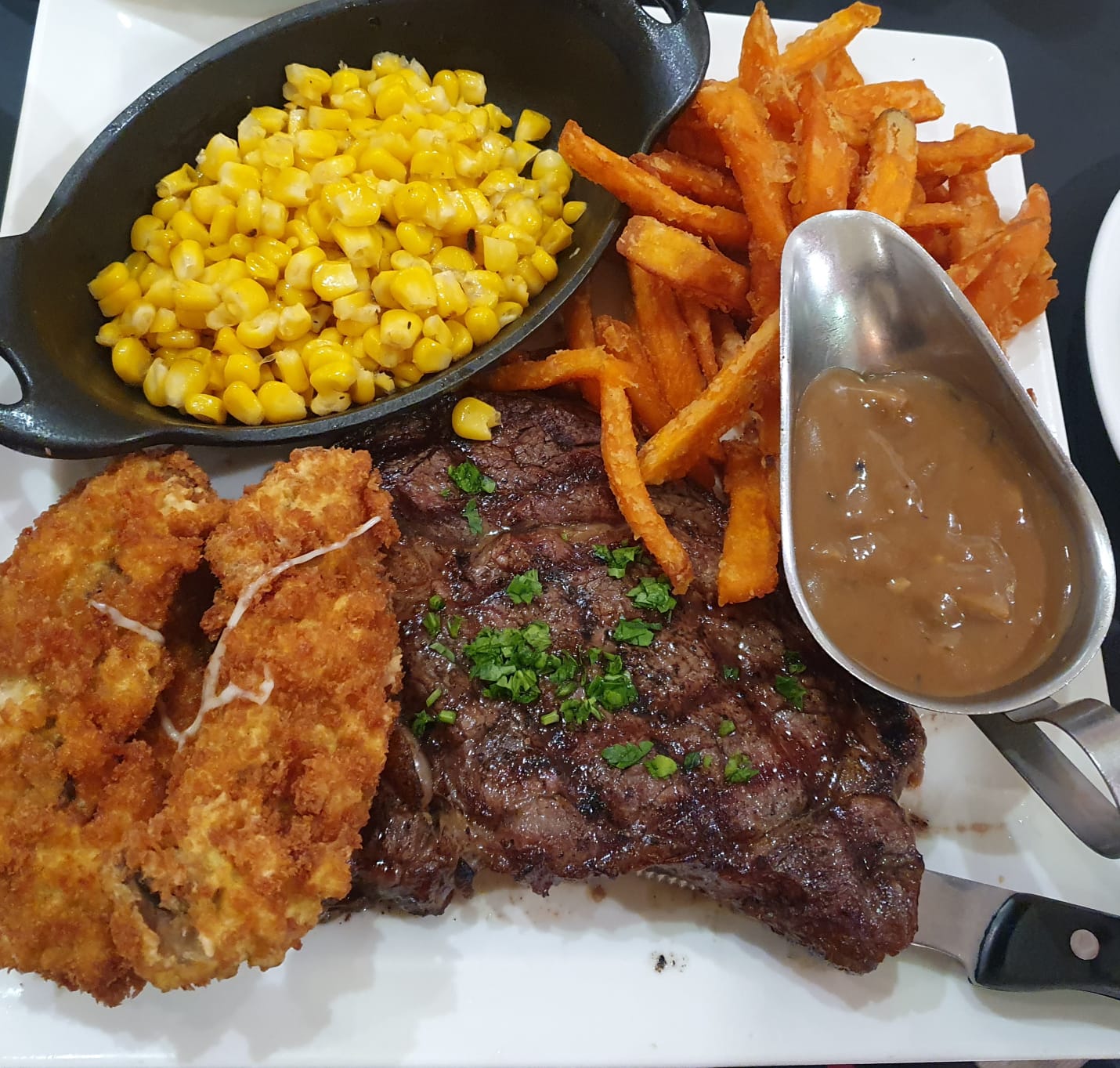 We decided to share some dishes and started our meal with classic cheese nachos and chopped salad. For main course, we shared a burger, a steak and crispy shrimps and despite being hungry, we still had plenty of food left. We highly recommend the sweet potato fries, mash potato or the corn on the cob as sides.