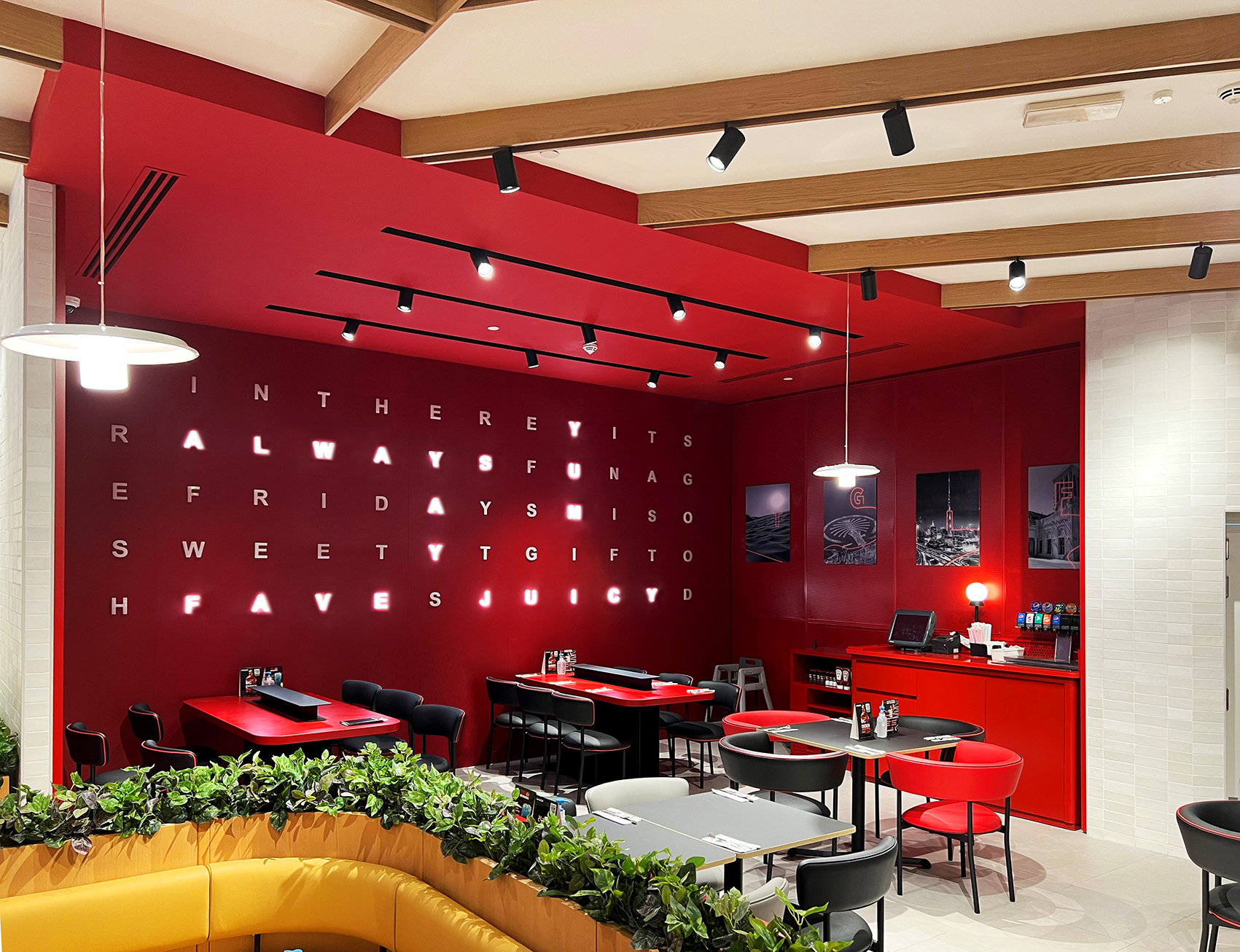 A vibrant, bold and sleek design, TGI Fridays is the one-stop destination and a must-visit for everyone. The refurbished interiors that feature bold hues, minimal design, and a creative pop of the restaurant’s branding.