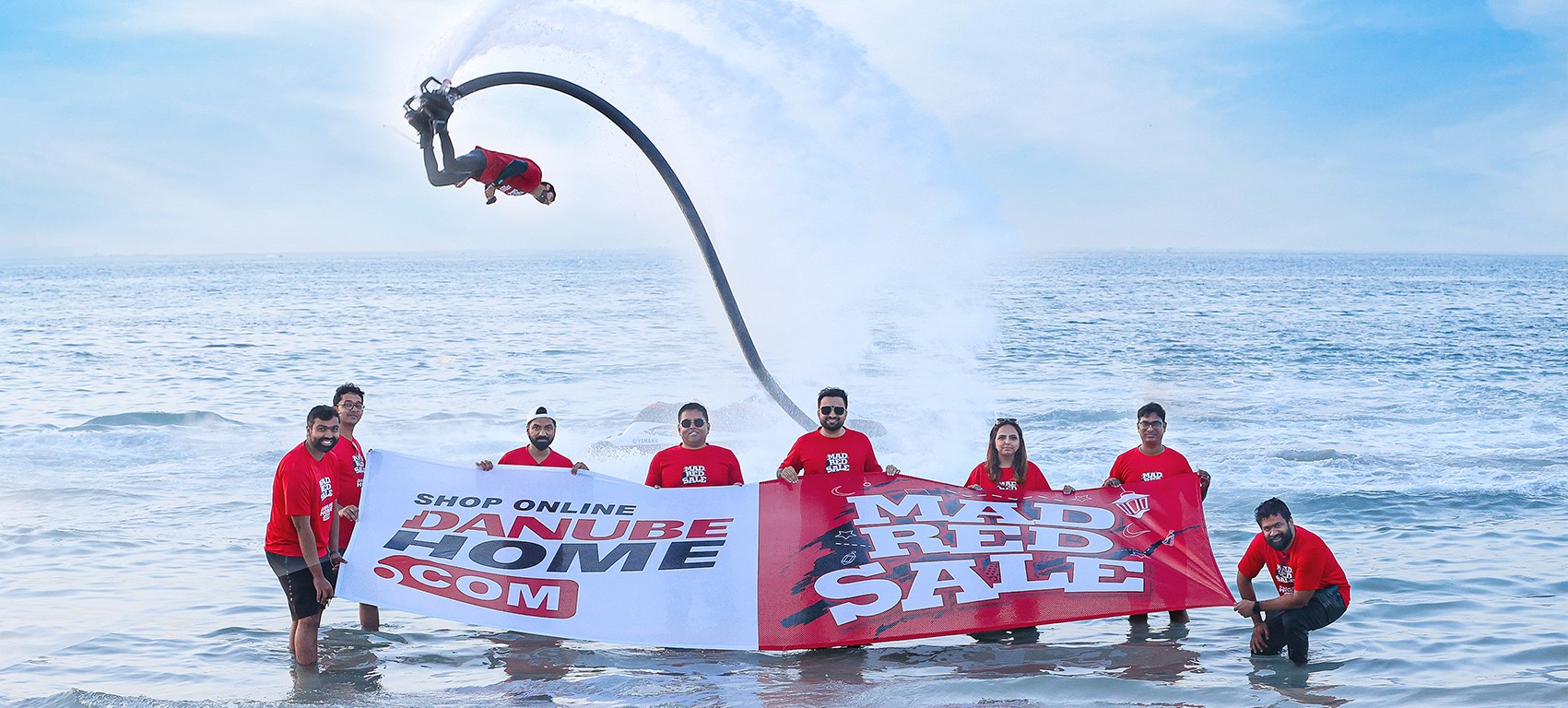 While Adel Sajan, the Group Managing Director announced the Mad Red Sale skydiving off a plane at a height of 13,000 feet last year, this year, Danube Home.com has taken to the seas of Dubai, announcing the maddest sale of the year while hover boarding 20 ft above water.