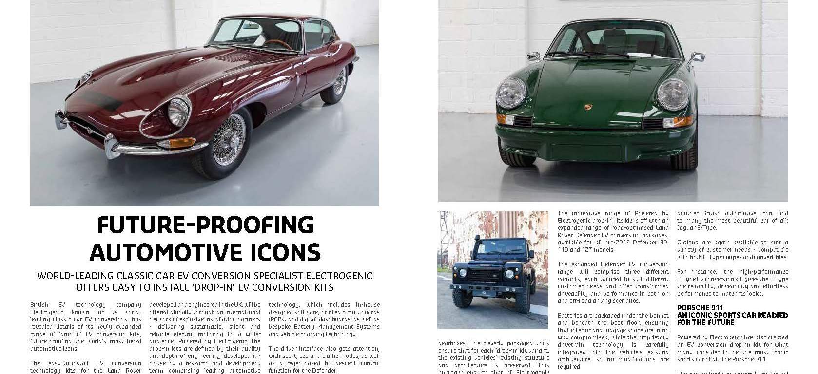 The easy-to-install EV conversion technology kits for the Land Rover Defender, Jaguar E-Type and classic Porsche 911 will be offered by the Oxford, UK-based Electrogenic’s recently expanded ‘Powered by Electrogenic’ arm.