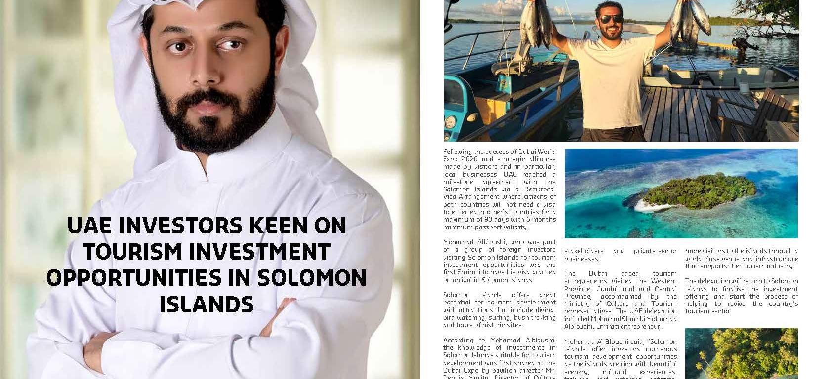 Mohamad Albloushi, who was part of a group of foreign investors visiting Solomon Islands for tourism investment opportunities was the first Emirati to have his visa granted on arrival in Solomon Islands. Solomon Islands offers great potential for tourism development with attractions that include diving, bird watching, surfing, bush trekking and tours of historic sites.