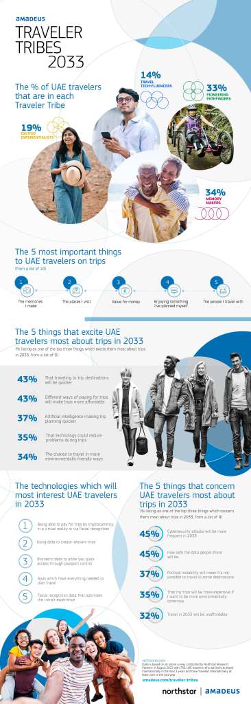 Traveller Tribes 2033 is a global research study commissioned by travel technology leader Amadeus to help travel sellers and providers look into the future and see how people in the UAE will travel in the coming years. Northstar Research Partners conducted an online published earlier this year including the views of 756 UAE travelers who are likely to travel internationally in the next 3 years and have travelled internationally at least once in the last year.
