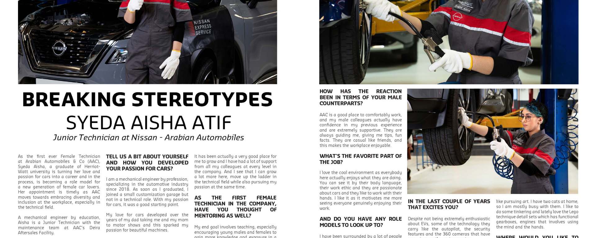 As the first ever Female Technician at Arabian Automobiles & Co (AAC), Syeda Aisha, a graduate of Herriot-Watt university is turning her love and passion for cars into a career and in the process, is becoming a role model for a new generation of female car lovers. Her appointment is timely as AAC moves towards embracing diversity and inclusion at the workplace, especially in the technical field.