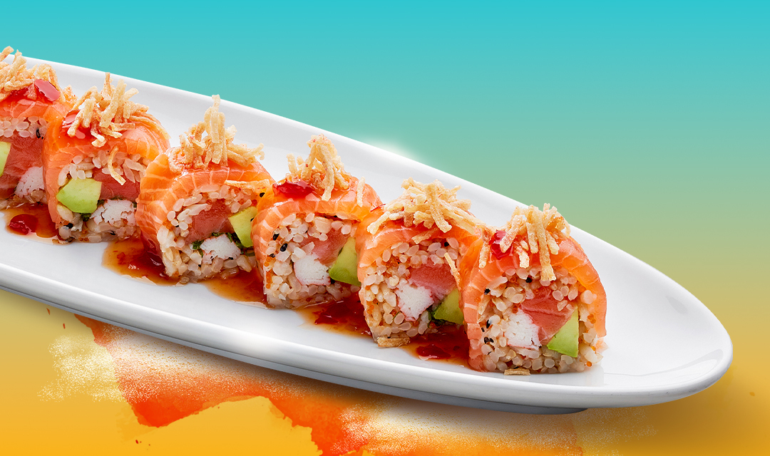 The Slammin Salmon roll features a delightful combination of flavors and textures, and comes with a delectable blend of fresh salmon, creamy avocado, and succulent crabstick, all elegantly nestled within a brown rice sushi roll. It’s an explosion of flavors that will leave you craving for more.