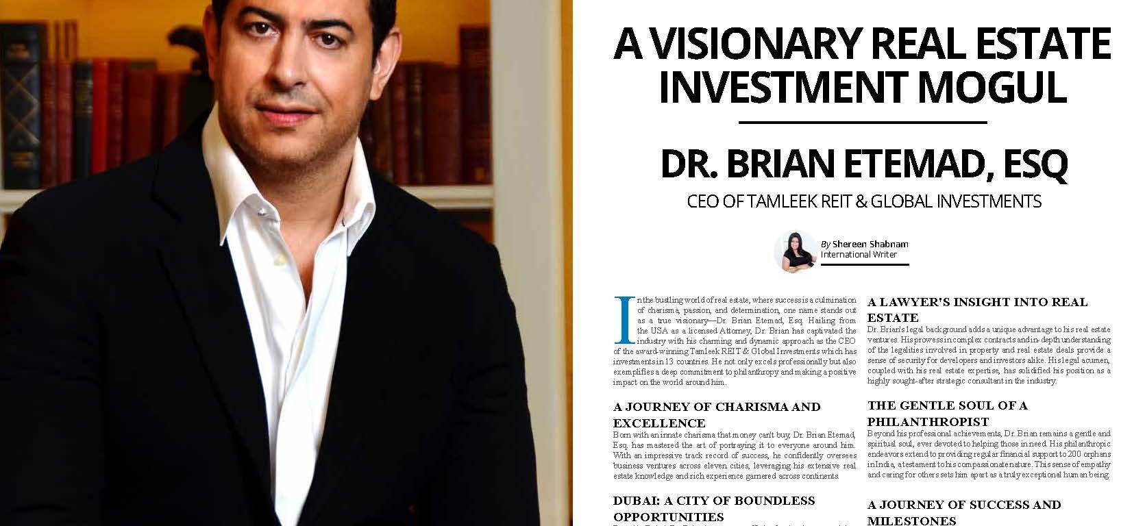 In the bustling world of real estate, where success is a culmination of charisma, passion, and determination, one name stands out as a true visionary—Dr. Brian Etemad, Esq. Hailing from the USA as a licensed Attorney, Dr. Brian has captivated the industry with his charming and dynamic approach as the CEO of the award-winning Tamleek REIT & Global Investments which has investments in 13 countries. He not only excels professionally but also exemplifies a deep commitment to philanthropy and making a positive impact on the world around him.