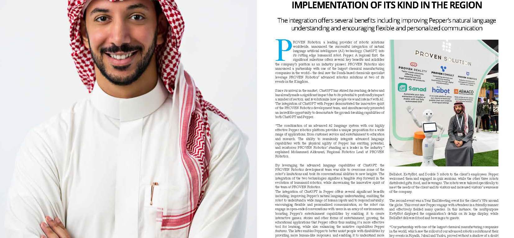 PROVEN Robotics, a leading provider of robotic solutions worldwide, announced the successful integration of natural language artificial intelligence (AI) technology, ChatGPT, into its cutting edge humanoid robot, Pepper. A regional first, the significant milestone offers several key benefits and solidifies the company’s position as an industry pioneer. PROVEN Robotics also announced a partnership with one of the largest chemical manufacturing companies in the world – the deal saw the Saudi-based chemicals specialist leverage PROVEN Robotics’ advanced robotics solutions at two of its events in the Kingdom.
