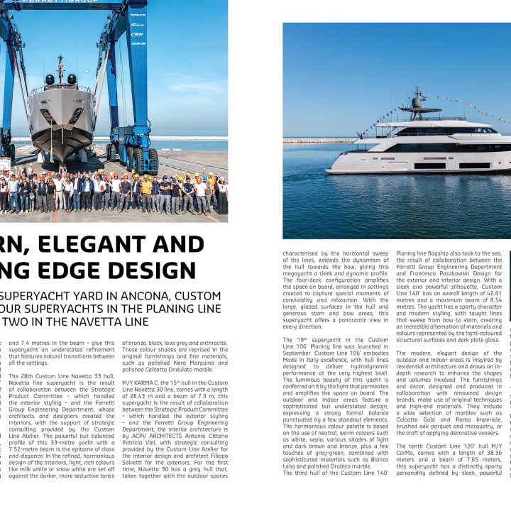 Ferretti Group Superyacht Yard in Ancona, Custom Line launches four superyachts in the Planing line and two in the Navetta line In little more than two … Continue reading Modern, Elegant and Cutting edge Design