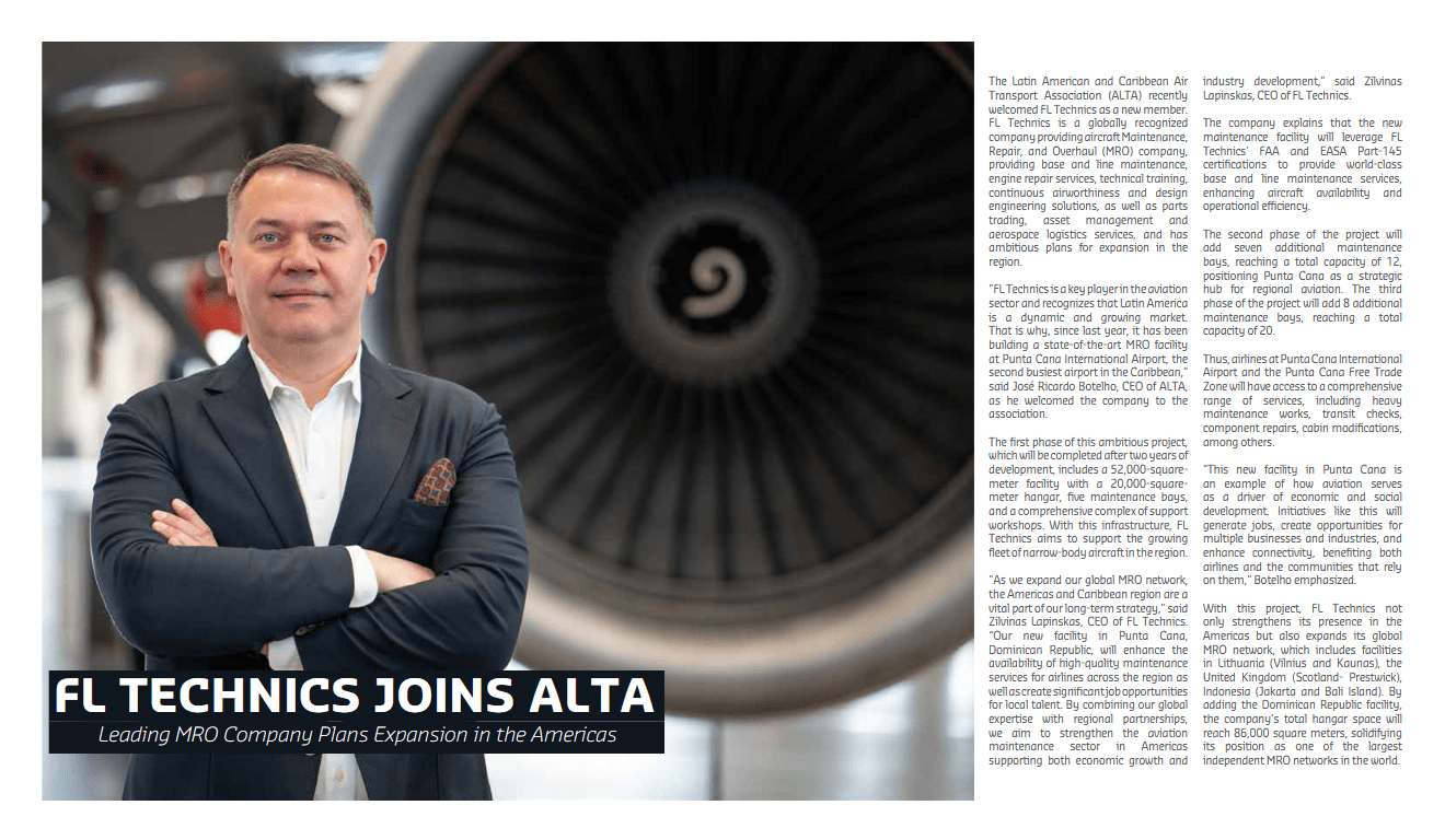 “FL Technics is a key player in the aviation sector and recognizes that Latin America is a dynamic and growing market. That is why, since last year, it has been building a state-of-the-art MRO facility at Punta Cana International Airport, the second busiest airport in the Caribbean,” said José Ricardo Botelho, CEO of ALTA, as he welcomed the company to the association.