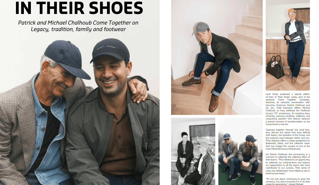 Level Shoes presented a special edition of their ‘In Their Shoes’ series, part of the seasonal ‘Come Together’ campaign, featuring an exclusive conversation with Executive Chairman Patrick Chalhoub and his son, Chief Executive Officer Michael Chalhoub, as they celebrate the Chalhoub Group’s 70th anniversary. An inspiring story of family, visionary ambition, resilience, and unwavering passion—this feature captures a pivotal moment of transformation as the Group enters a new era.