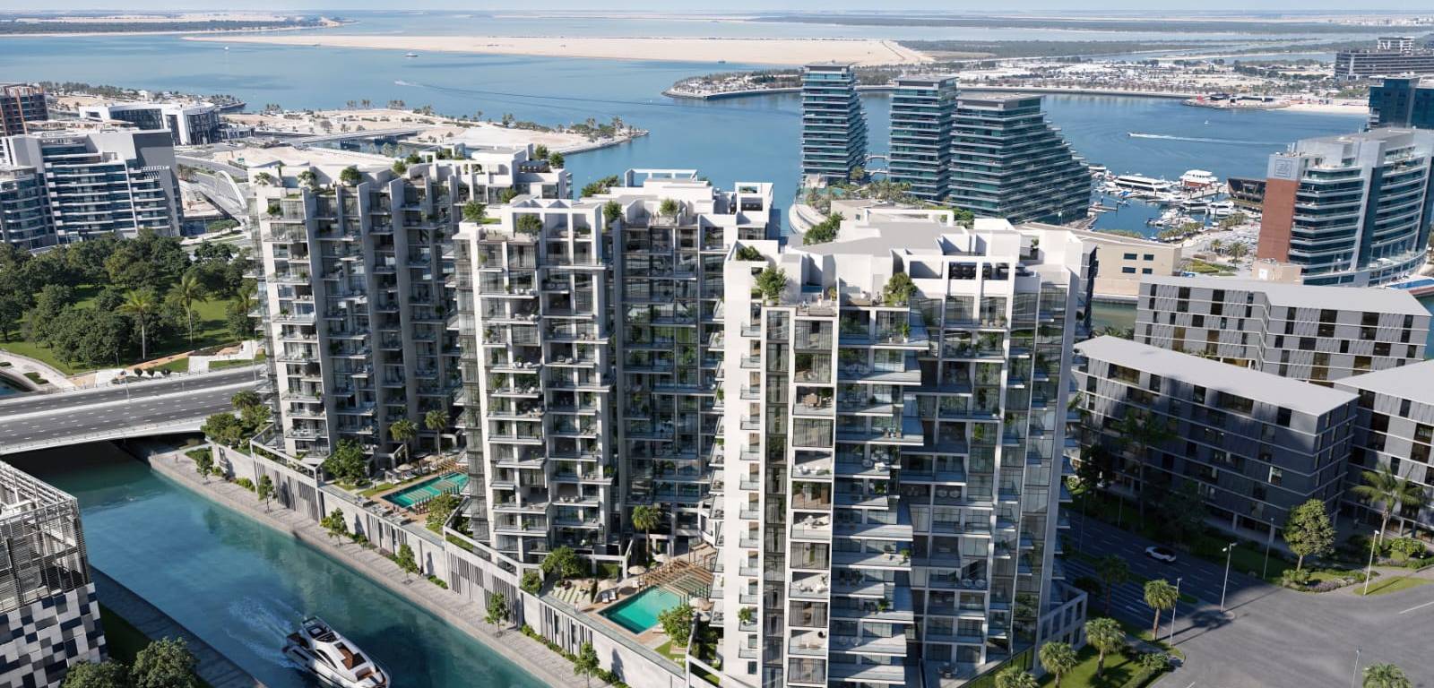 Recreational features include three rooftop infinity pools, one on each tower, as well as two ground-floor pools surrounded by landscaped green spaces and private seating areas, creating a resort-inspired atmosphere throughout the development. Strategically located at the main entrance of Al Raha Beach, the project enjoys direct access to Yas Island, Zayed International Airport, and central Abu Dhabi, making it an attractive choice for both families and investors seeking a well-connected waterfront address.