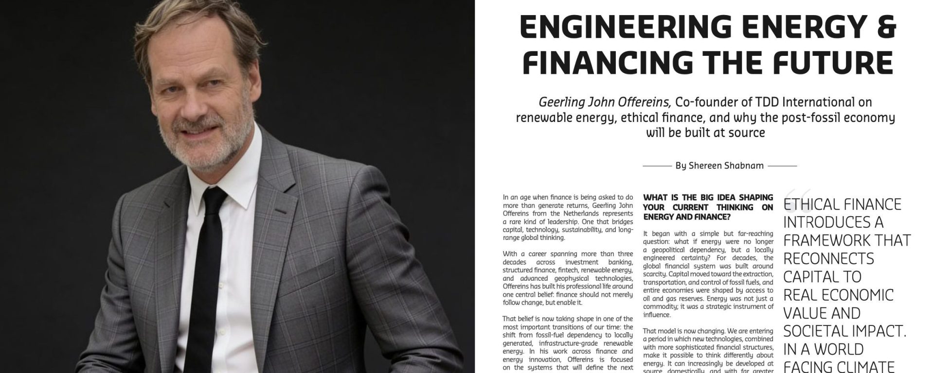 In this cover story conversation, Offereins discusses why ultra-deep geothermal energy deserves more attention, how ethical finance can reshape investment logic, and why the future economy will belong to those who know how to align capital with sustainability, sovereignty, and innovation.